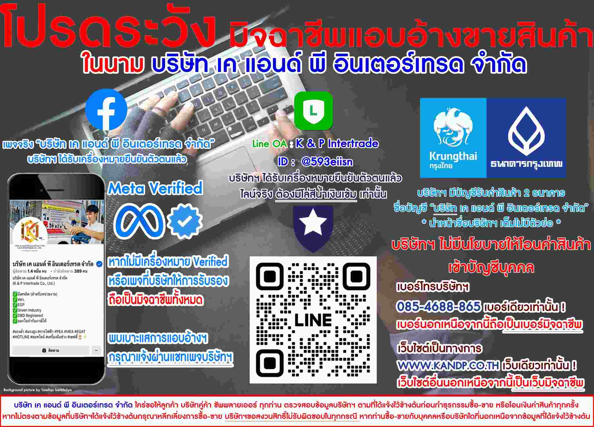 บริษัท เค แอนด์ พี อินเตอร์เทรด จำกัด ใคร่ขอให้ลูกค้า บริษัทคู่ค้า ซัพพลายเออร์ ทุกท่าน ตรวจสอบข้อมูลบริษัทฯ ตามที่ได้แจ้งไว้ข้างต้นก่อนทำธุรกรรมซื้อ-ขาย หรือโอนเงินค่าสินค้าทุกครั้ง หากไม่ตรงตามข้อมูลที่บริษัทฯได้แจ้งไว้ข้างต้นกรุณาหลีกเลี่ยงการซื้อ-ขาย บริษัทฯขอสงวนสิทธิ์ไม่รับผิดชอบในทุกกรณี หากท่านซื้อ-ขายกับบุคคลหรือบริษัทใดที่นอกเหนือจากข้อมูลที่ได้แจ้งไว้ข้างต้น